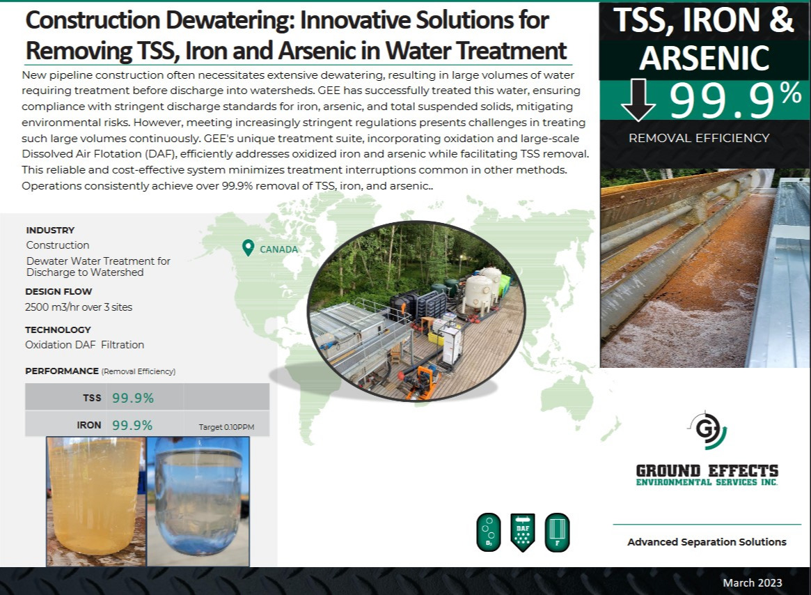 Solution: The rental solution provided by Ground Effects included chemical addition/coagulation, dissolved air flotation (DAF), media filtration, and sludge de-watering.