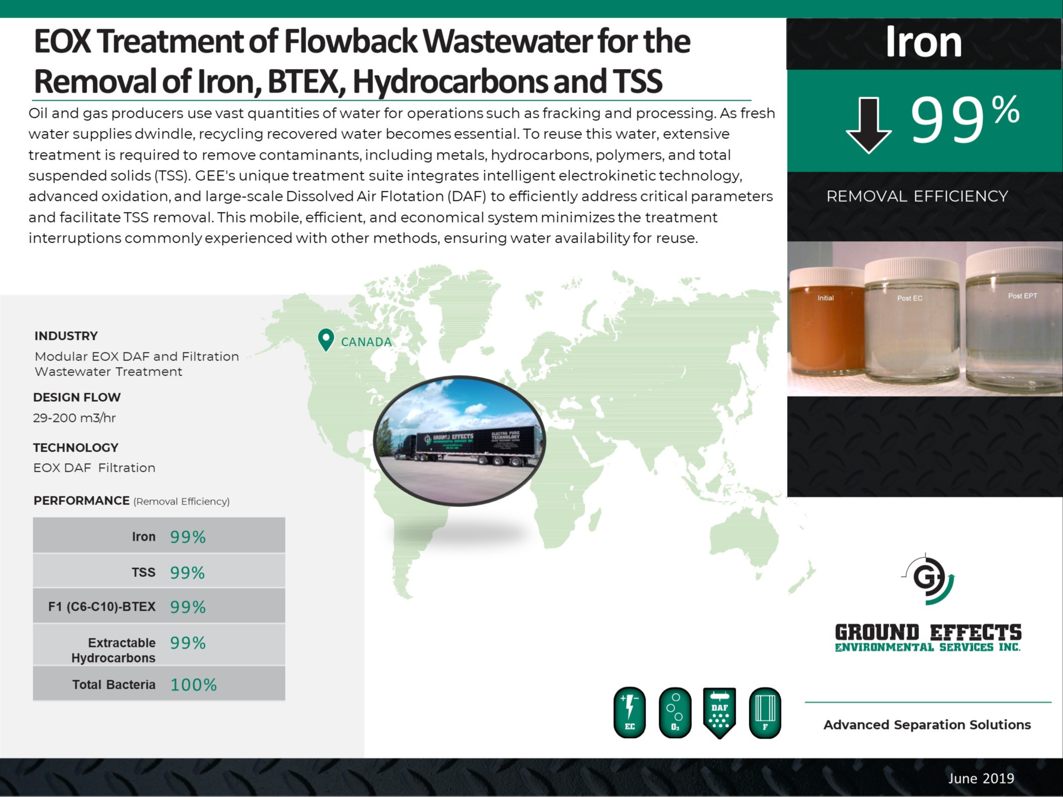 GEE uses electrocoaguation with iron electrodes with ozone as a catalyst to create Fenton’s Reagent as one of the most powerful oxidants on the planet. GEE is a world leader in developing advanced chemical-free technologies to treat wastewater. GEE has been creating produced and frac water solutions for the oil & gas industry for more than 20 years. GEE has numerous awards for innovations and our systems operate in countries around the world.